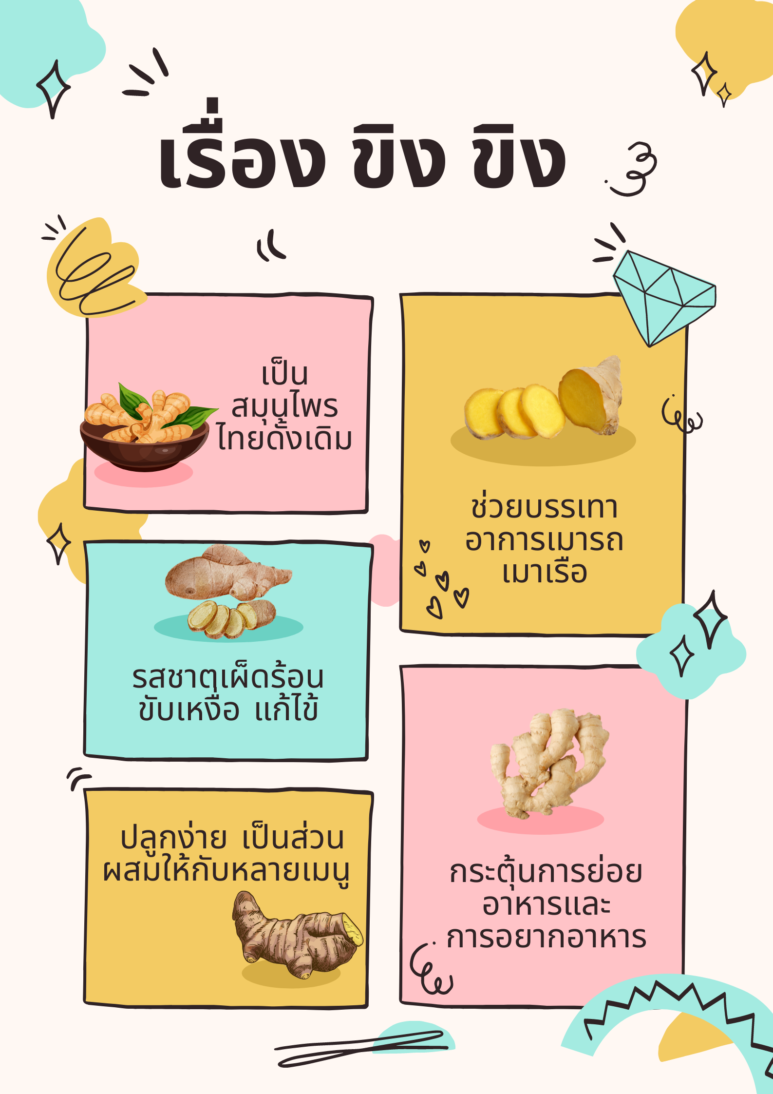 ขิง เนี่ยเป็นสมุนไพรไทย ที่มีมายาวนานมากเลยนะ มีประโยชน์สุดๆ ไม่ว่าจะช่วยเรื่องอาการแก้เมารถ เมาค้าง เมาเรือ แถมยังช่วยกระตุ้นการอยากอาหารได้อีกด้วย